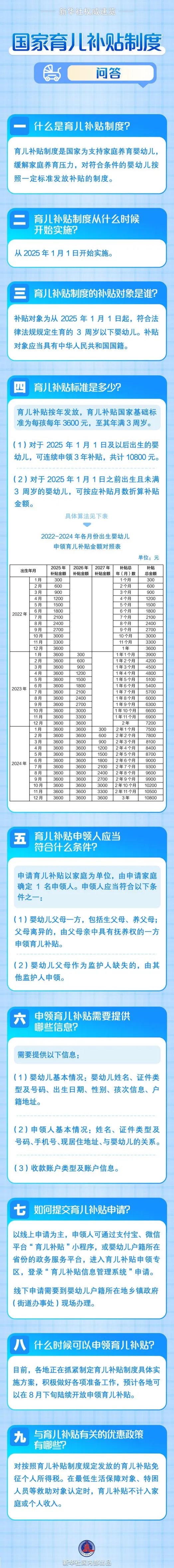 目前,各地正在抓紧制定育儿补贴制度具体实施方案,积极做好各项准备工作,预计各地可以在8月下旬陆续开放申领育儿补贴。